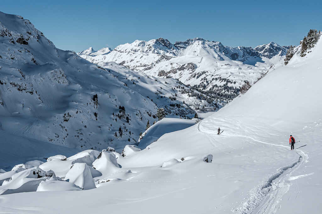 Fast alle Varianten sind ohne Aufstieg direkt vom Lift aus zu erreichen. Es gibt aber lohnende Ausnahmen: mit nur ca. 250 Hm Aufstieg zum Wendesattel warten fast 1.000 Hm Abfahrt quer durch allerbestes Freeride-Gelände auf dich!